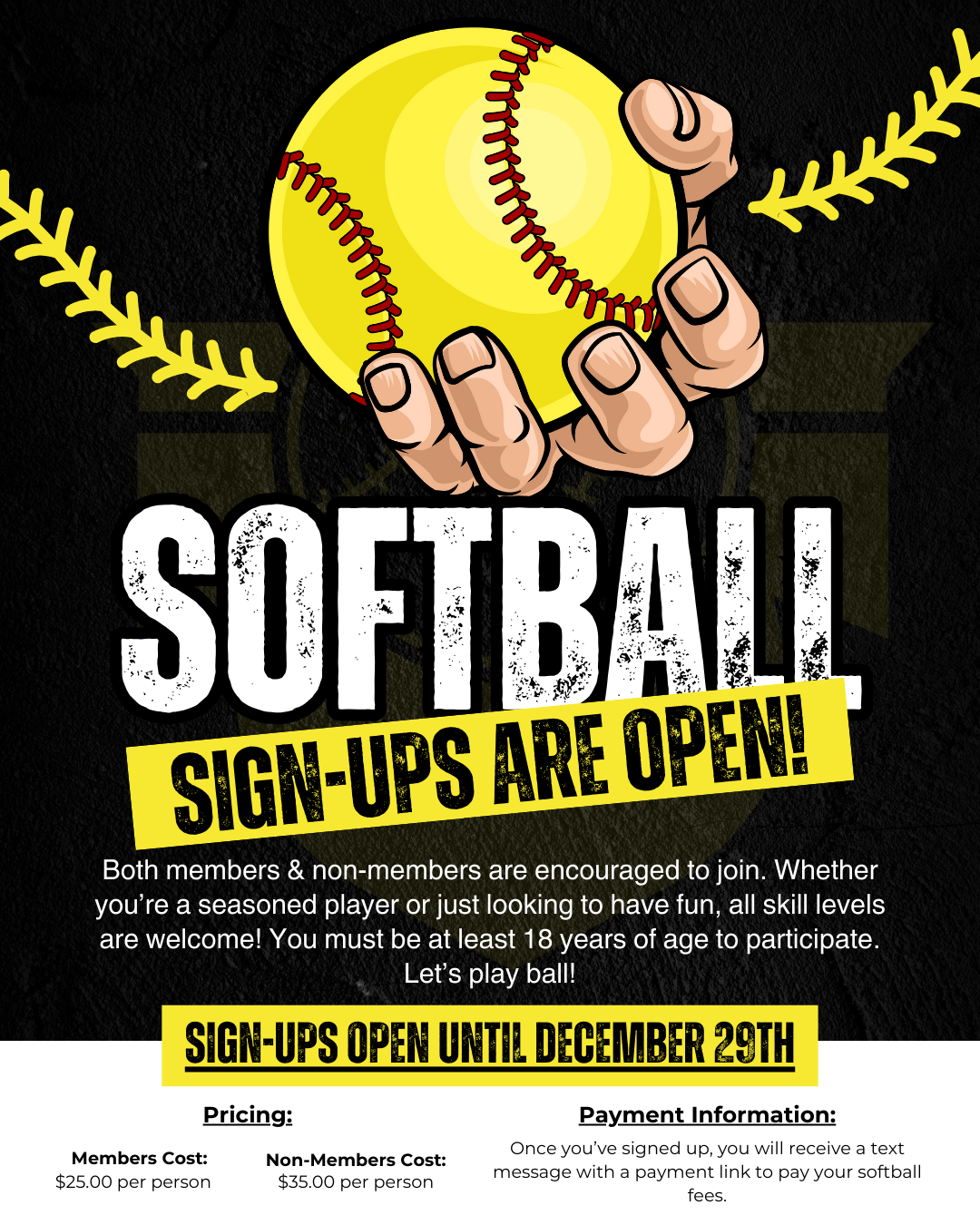 Winter Softball League | Last Day to Sign Up Monday, December 29, 2025 9:00 AM 5:00 PM 09:00 17:00 Providence HOA 809 Oakcrest Dr. Providence Village, TX 76227 (map) Google Calendar ICS Click here to sign up for the 2026 Winter Softball League.