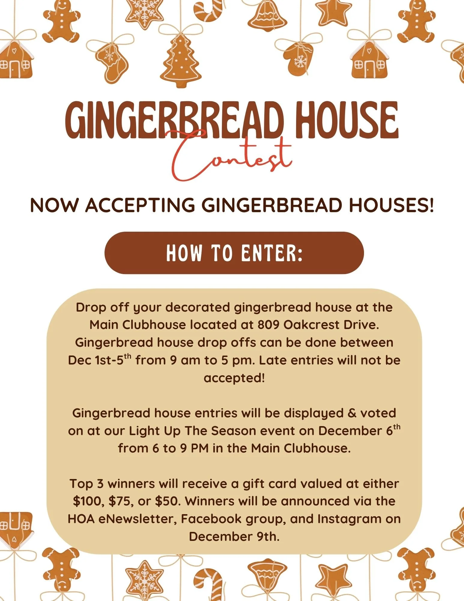 Gingerbread House Contest | Last Day to Enter Friday, December 5, 2025 9:00 AM 5:00 PM 09:00 17:00 Main Clubhouse 809 Oakcrest Dr. Providence Village, TX 76227 (map) Google Calendar ICS