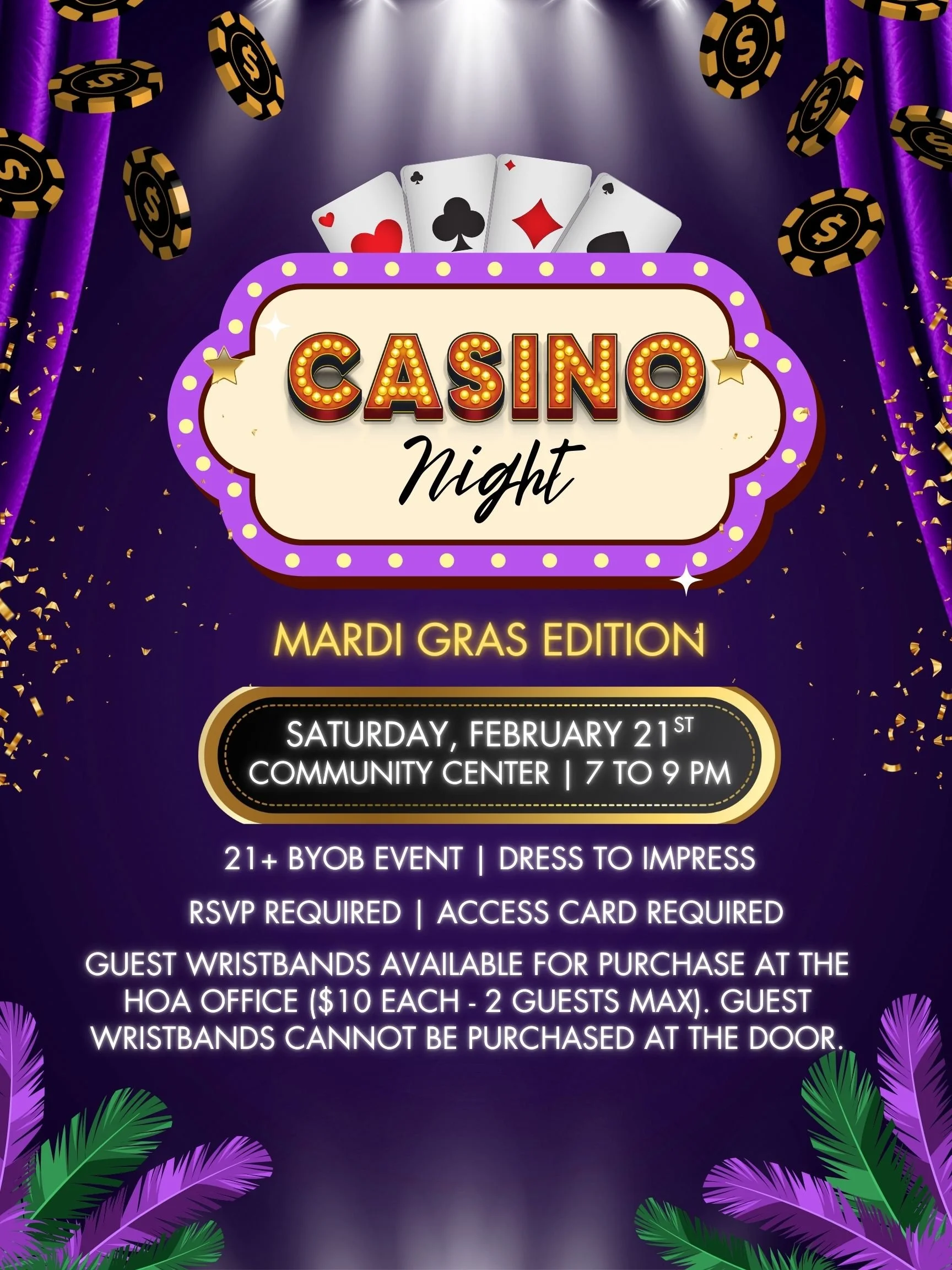 Join us for a come & go Mardi Gras Casino Night on February 21st from 7 to 9 PM at the Community Center!