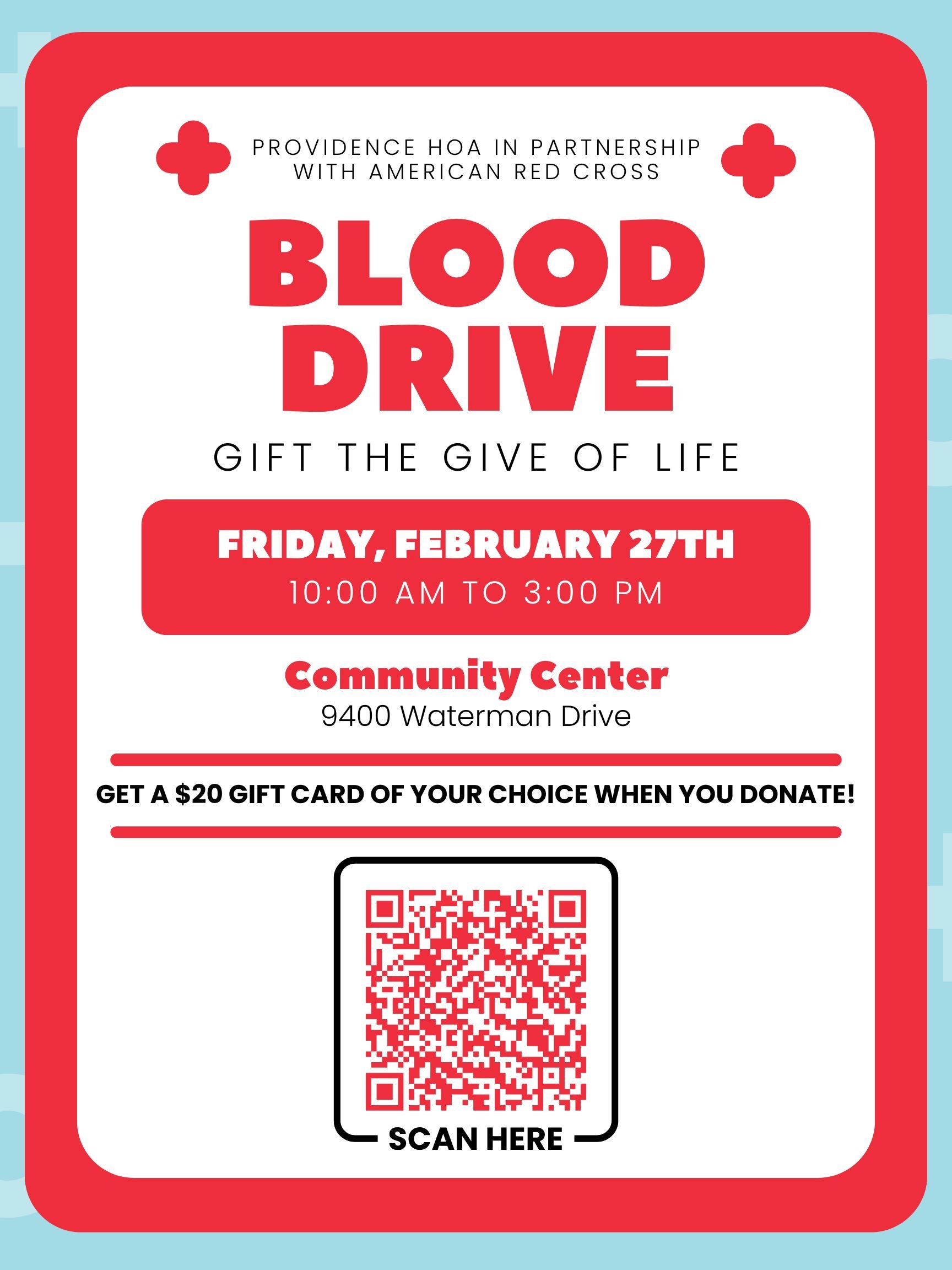 Give the gift of life! Join us in partnership with the American Red Cross for a community blood drive.