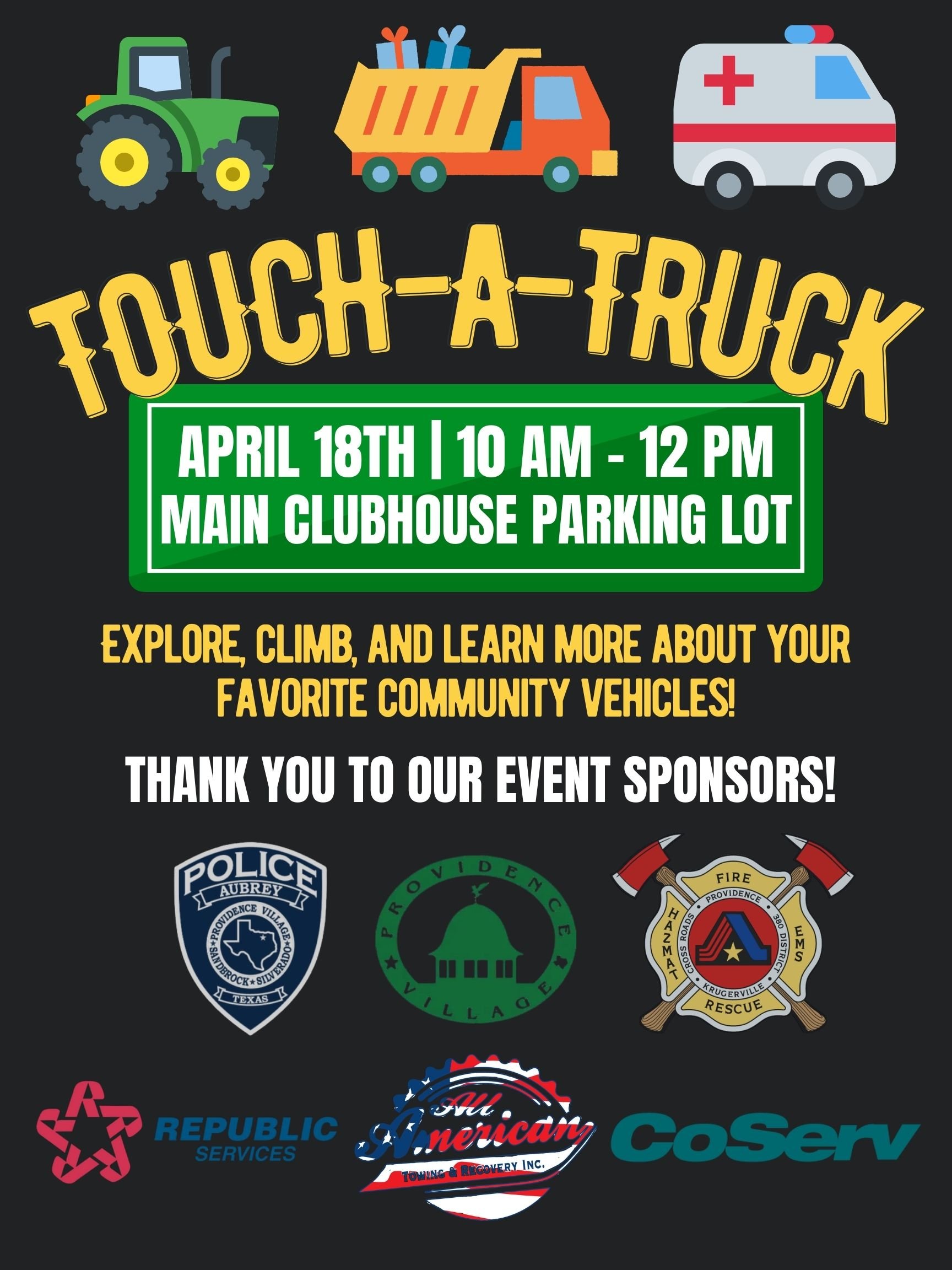 Join us for a come & go Touch-A-Truck event on April 18th from 10 AM to 12 PM at the Main Clubhouse Parking Lot!