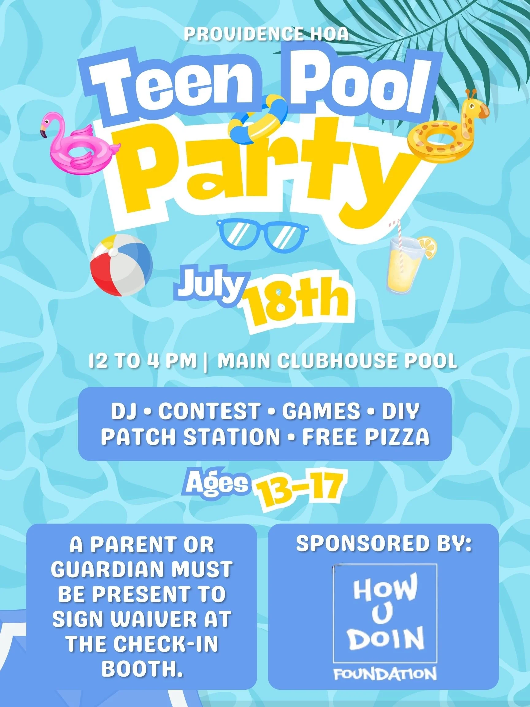 Get ready for an afternoon of music, games, and summer fun designed just for teens. Invite your friends, make a splash, and enjoy a high‑energy poolside party created especially for ages 13 to 17.