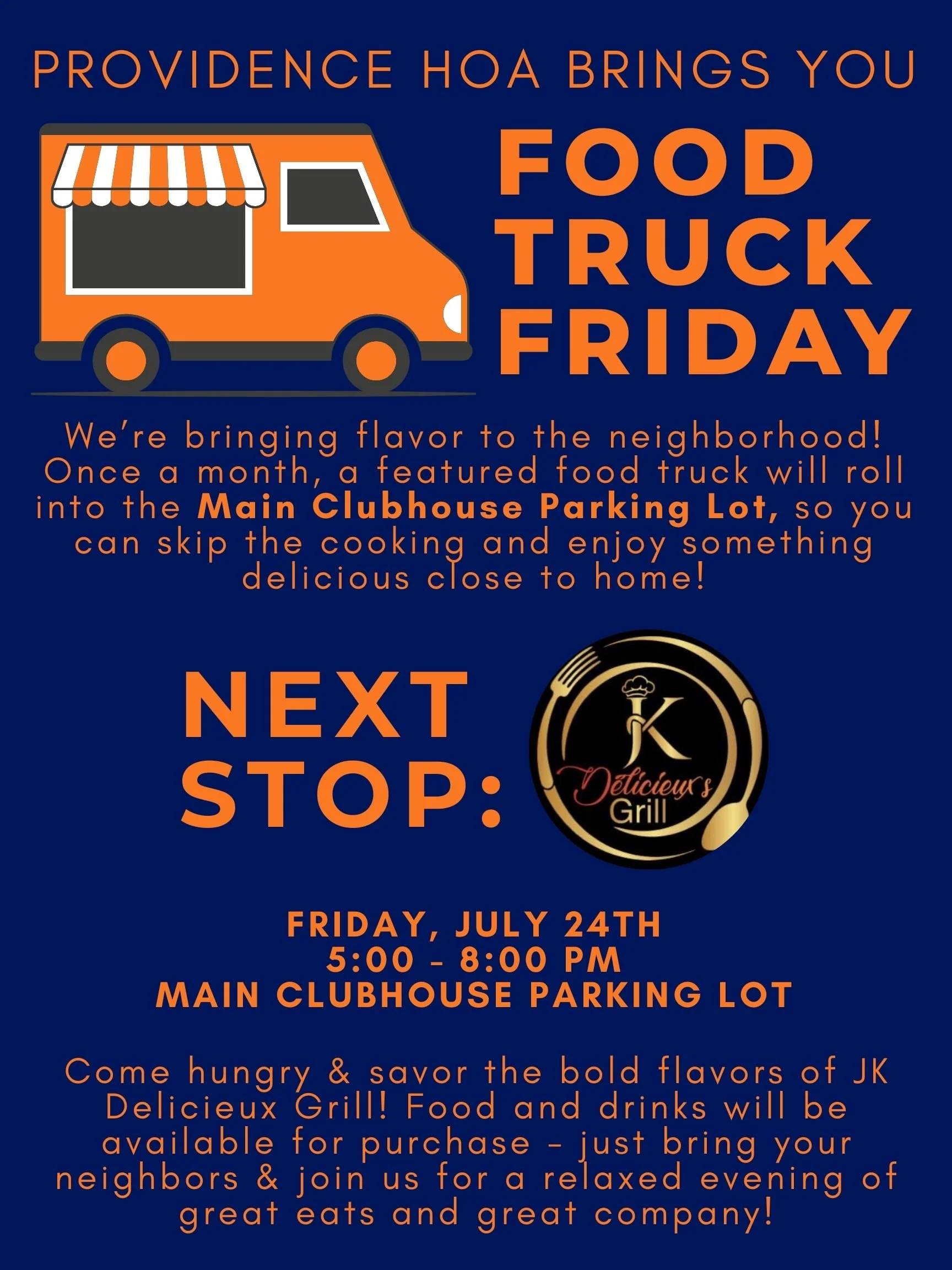 Skip the kitchen - dinner’s on us (well, sort of)! Join us for this month’s tasty feature: JK Delicieux Grill: Jamaican cuisine. Grab your friends, bring your appetite, and enjoy a night of bold flavors right here in the community. Food and drinks available for purchase.