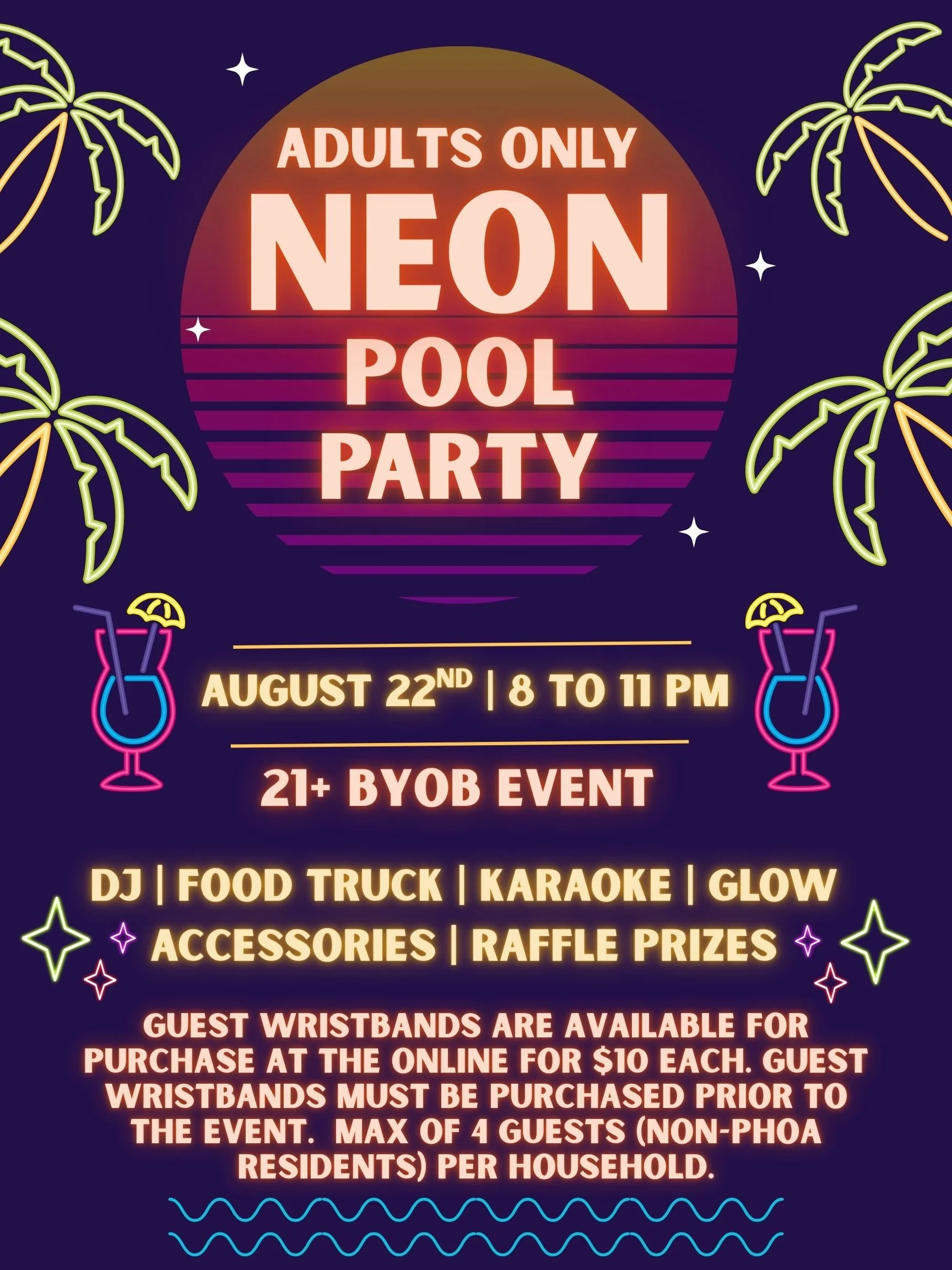 Kick off the end of summer with a glowing good time at our Adults‑Only Neon Night Pool Party! We’re lighting up the night with a DJ, karaoke, great food, and all the neon vibes you need for an unforgettable evening.