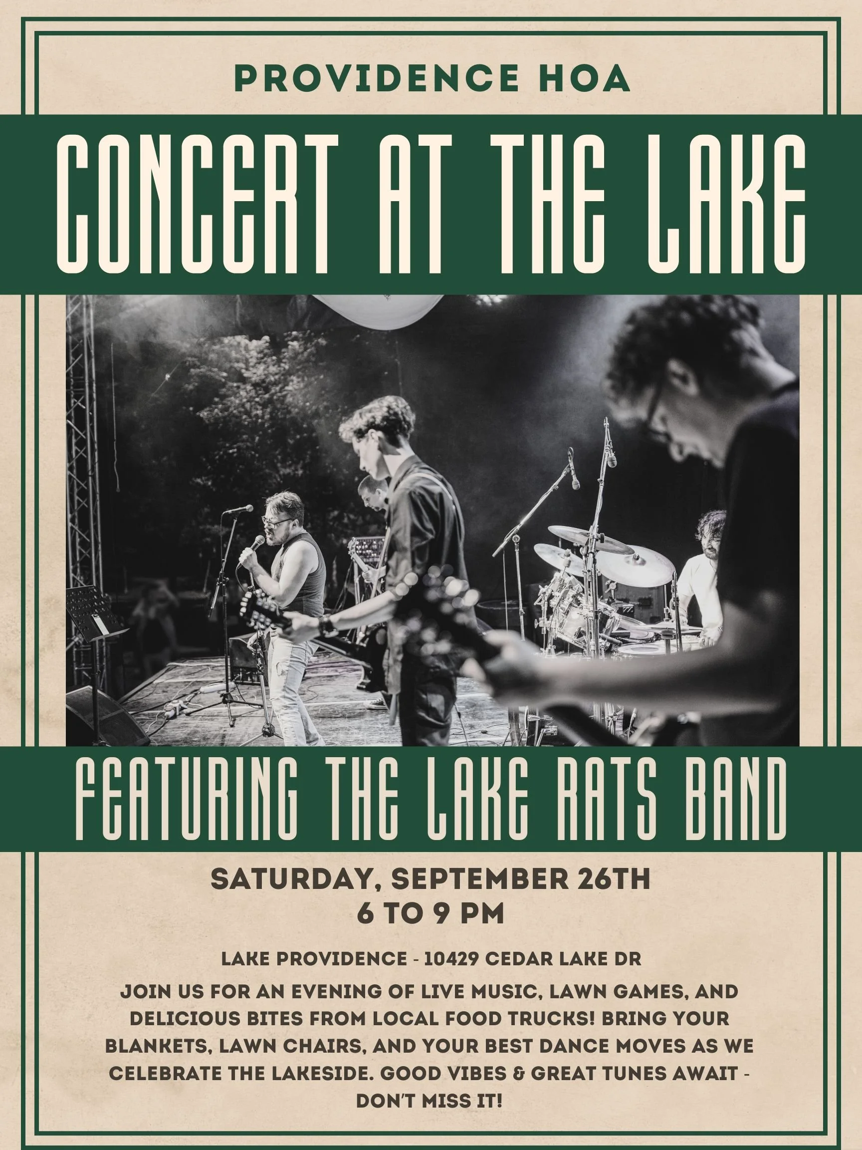 Join us for a relaxing evening by the water at our Concert at the Lake! Enjoy live music from the Lake Rats band, lawn games, and delicious offerings from local food trucks. It’s the perfect way to spend a fall evening outdoors with neighbors and friends.